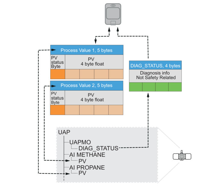 DIAG_Status-Byte ist 4 Bytes lang und enthält Daten zur Geräte-Performance und Signaleigenschaften. Die Parameter des UAP sind 4+1 Bytes lang. Jeder Parameter verfügt über ein Status-Byte, das die Qualität des Werts angibt.